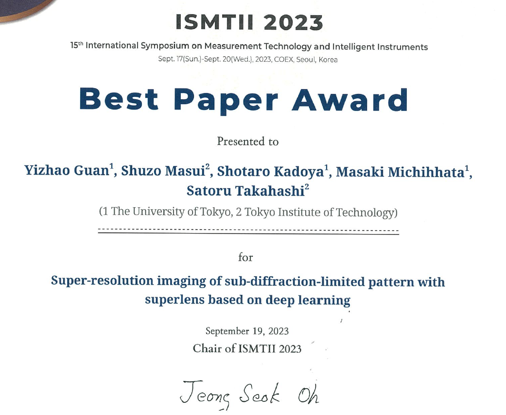 Recommended citation: Y. Guan. S.Masui, S. Kadoya, M. Michihata and S. Takahashi, "Super-resolution Imaging of Sub-diffraction-limited Pattern with Superlens based on Deep Learning." ISMTII 2023, A084, Sep. 2022, Seoul, Korea.